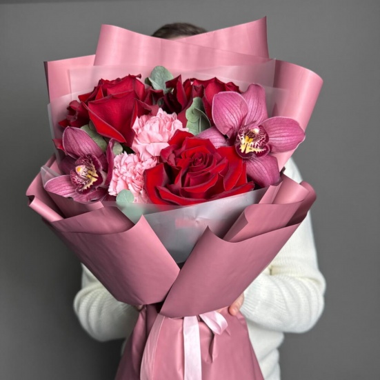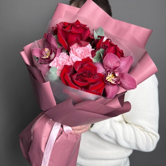 Букет из 3 красных роз, орхидей и диантуса в Кинешме