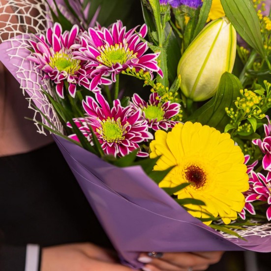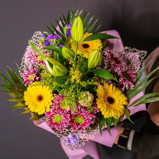 Букет с розами, хризантемами, лилиями, герберами